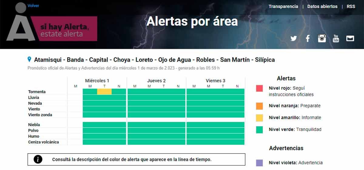 A su vez, el SMN emitió en su último informe un alerta amarilla por tormenta para los departamentos Atamisqui, Banda, Capital, Choya, Loreto, Ojo de Agua, Robles, San Martín y Silípica.