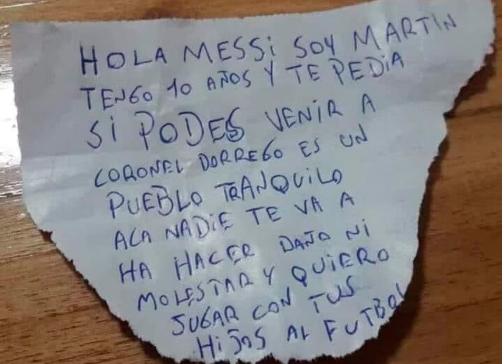 “Hola Messi, soy Martín tengo 10 años y te pedía si podés venir a Coronel Dorrego. Es un pueblo tranquilo, nadie te va a hacer daño ni molestar. Quiero jugar con tus hijos al fútbol”, reza la emotiva nota que se hizo viral.