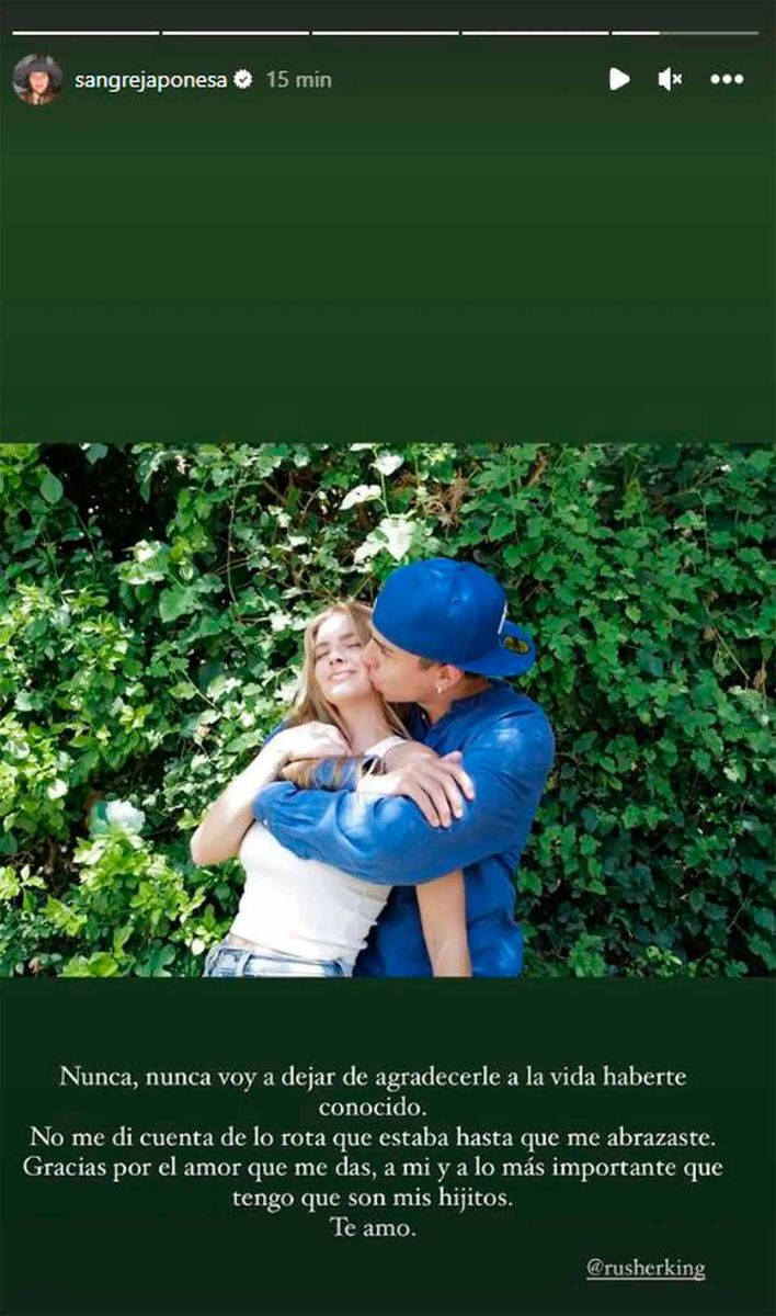 La publicación, que fue realizada en las historias de la red social de la camarita, estuvo acompañada por una foto de ellos abrazados. Mientras ella sonríe, él le da un beso en el cachete. La fotografía en cuestión fue tomada hace unos días en el cumpleaños de una amiga de la China, donde ambos asistieron junto a los hijos de la actriz.