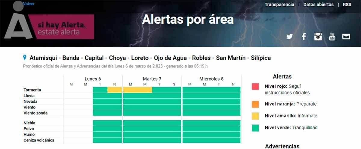 La alerta meteorológica rige para los siguientes departamentos: Atamisqui - Banda - Capital - Choya - Loreto - Ojo de Agua - Robles - San Martín – Silípica.