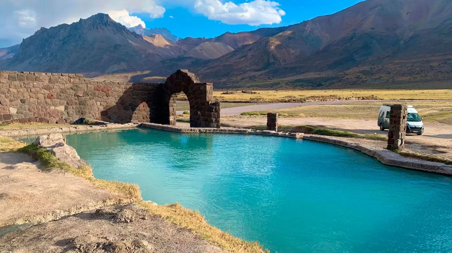 En Mendoza, más precisamente en el pueblo El Sosneado, hay un hotel que ya no funciona como tal, no tiene servicios, habitaciones, ni está al cien por cien completo. Es decir, solo quedaron sus ruinas, pero todavía cuenta con piletones de termas.