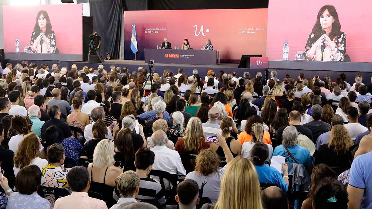 Cristina Fernández de Kirchner recibió el reconocimiento "por el papel relevante que ha tenido en el desarrollo del sistema universitario argentino en general y en la creación y desarrollo de la Universidad Nacional de Río Negro", según argumentaron las autoridades. El discurso de la vicepresidenta llevó el nombre de "¿Hegemonía o consenso? Ruptura del pacto democrático en una economía bimonetaria: inflación y FMI, crisis de deuda y fragmentación política".