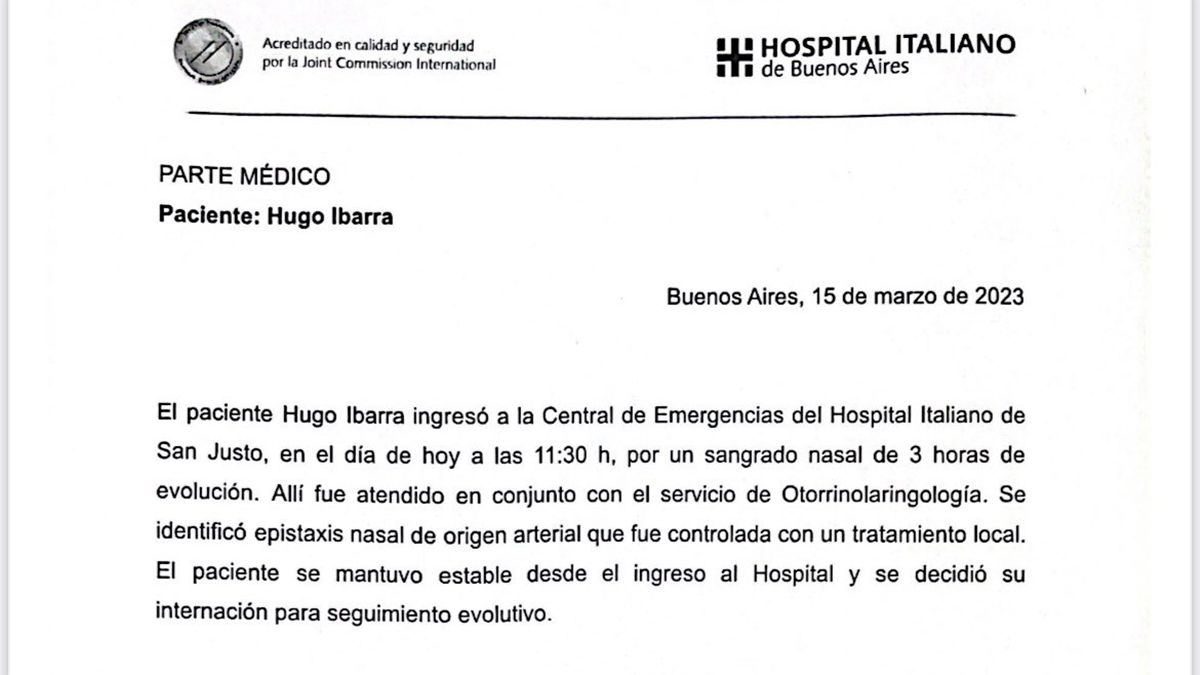 "El paciente Hugo Ibarra ingresó a la Central de Emergencias del Hospital Italiano de San Justo, en el día de hoy a las 11.30h, por un sangrado nasal de 3 horas de evolución. Allí fue atendido en conjunto con el servicio de Otorrinolaringología", inicia el comunicado firmado por la Dirección Médica. Y dio detalles sobre lo que le pasó al DT xeneize: "Se identificó epistaxis nasal de origen arterial que fue controlada con un tratamiento local. El paciente se mantuvo estable desde el ingreso al Hospital y se decidió su internación para seguimiento evolutivo".