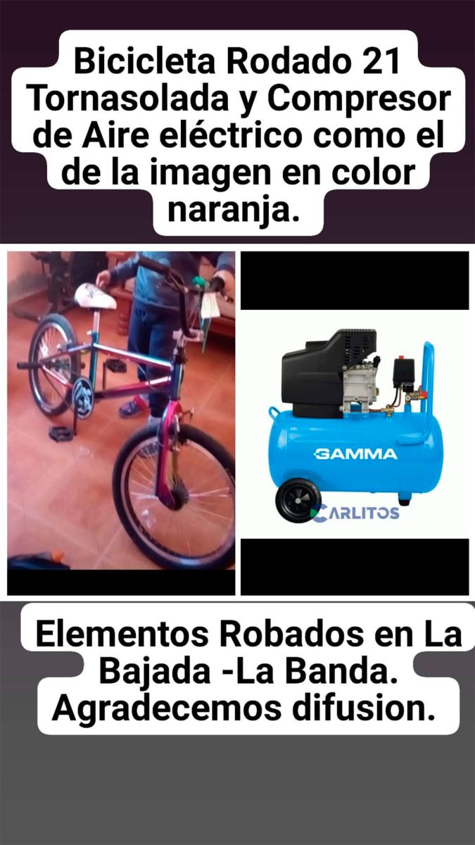 Los elementos sustraídos fueron una bicicleta Rodado 21 Tornsolada, valuada en 100 mil pesos apróximadamente, un compresor de aire eléctrico de 50 litros de color naranja y otros bienes de menor valor.