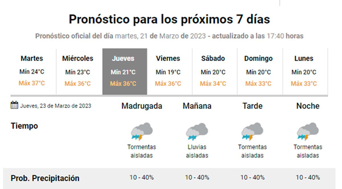 Según el pronóstico extendido de dicho organismo, para este miércoles se esperan 23° de mínima y 36° de máxima, mientras que para el jueves hay hasta 40% de probabilidades de lluvias durante todo el día.