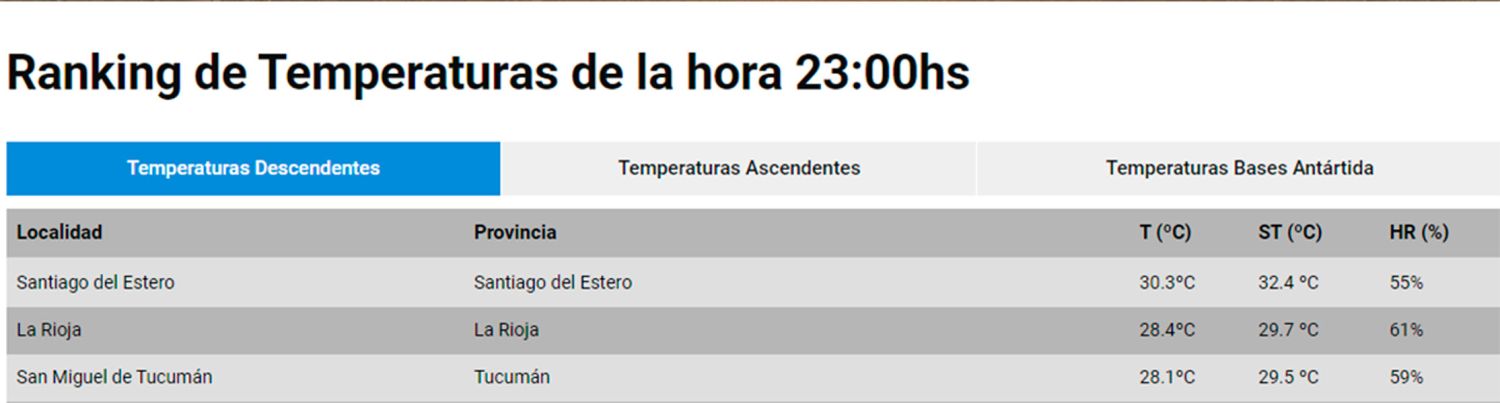 El otoño comenzó pero las altas temperaturas parecen no tener fin. Según el Servicio Meteorológico Nacional, la ciudad de Santiago del Estero, a las 23 de este martes, lideró el ranking de las ciudades más calientes del país con 30.3° y una sensación térmica de 32.4°, en segundo lugar se encuentra La Rioja con 28.4° y en tercer lugar Tucumán con 28.1°.