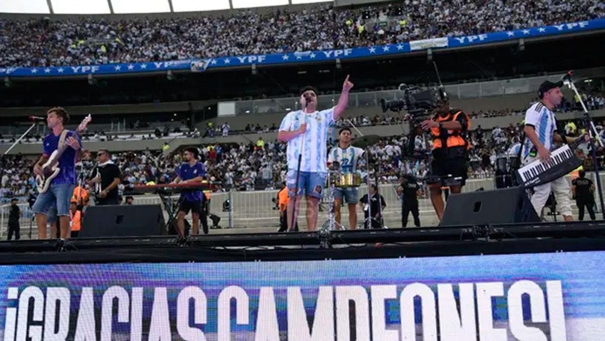 La banda liderada por Juani Giorgetti se presentó en vivo con seis músicos en el escenario e inició su número interpretando la canción de cancha "Vamos Argentina, sabes que yo te quiero..." que levantó nuevamente al público.