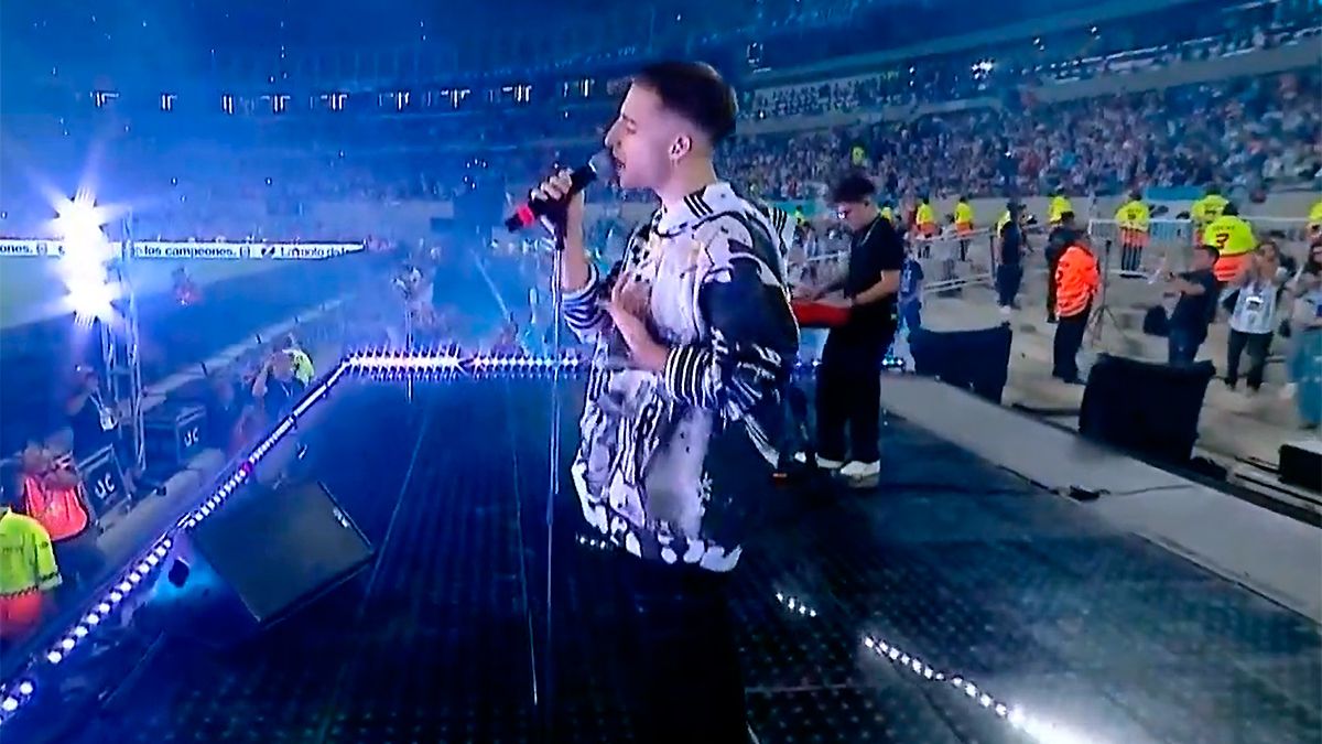 Wos se subió al escenario ubicado en la zona baja inferior de la platea Belgrano, junto con dos músicos, uno en guitarra electroacústica y otro en teclados, para cantar frente a 83 mil personas el éxito que tocó la fibra íntima de los campeones del mundo.