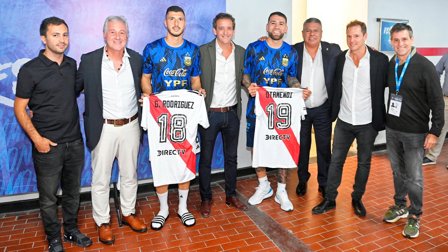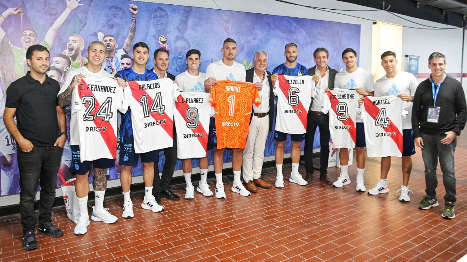 El presidente Jorge Brito encabezó una comitiva dirigencial que le entregó en mano camisetas a Enzo Fernández, Exequiel Palacios, Julián Álvarez, Germán Pezzella, Gonzalo Montiel y Guido Rodríguez, todos campeones del mundo surgidos de las inferiores. A ellos se sumó Franco Armani, el arquero actual de la entidad que es el único futbolista de la liga local que se apoderó del título.