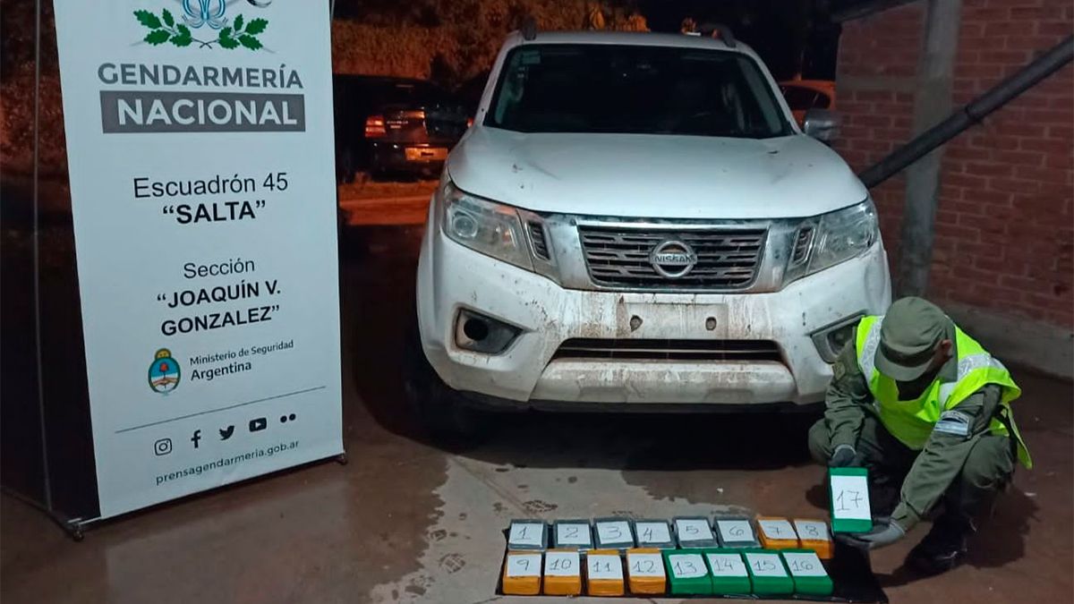 En presencia de testigos, y con autorización de la Unidad Fiscal Federal de Salta, el personal de la Fuerza efectuó una requisa del interior de la camioneta y halló un bolso de mano que contenía 17 paquetes rectangulares con una sustancia blancuzca.