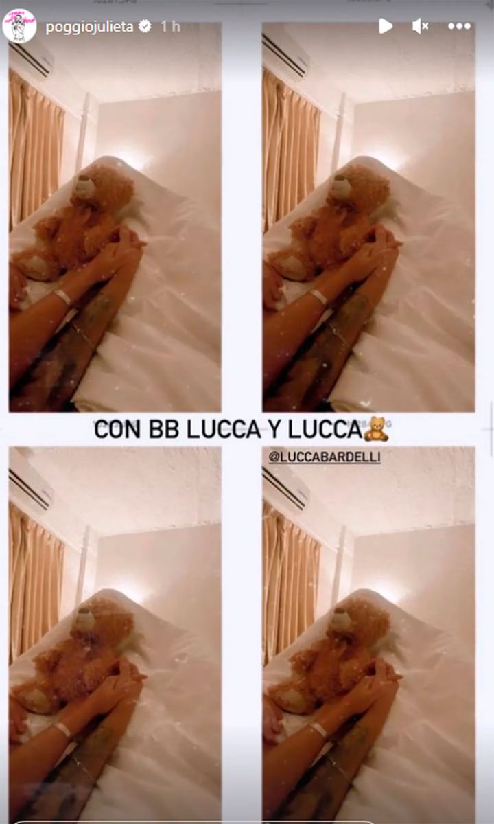 “Con bebé Lucca y Lucca”, escribió la influencer en una historia que subió en sus historias de Instagram y donde se la ve tomada la mano del modelo. La imagen -en la que también aparece un peluche que él le regaló- pertenece a una escena íntima, ya que se los puede ver a los dos acostados y bajo las sábanas.