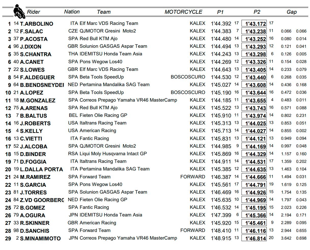 Arbolino marcó un registro de 1m43.172s en su mejor vuelta para dejar atrás a Filip Salac, del equipo QJMotor Gresini Moto2, y a Pedro Acosta, del Red Bull KTM Ajo por 66 y 80 milésimas, respectivamente.