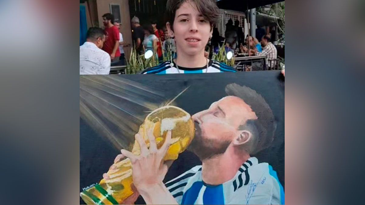 Tal es el caso de Marianella Fernández, una joven y talentosa artista de 17 años. La cual se acercó hacia las inmediaciones del hotel en el que se hospedaban con un cuadro pintado por ella, en acrílico sobre lienzo, con una técnica de primer nivel en la que retrataba a Messi besando la Copa del Mundo.
