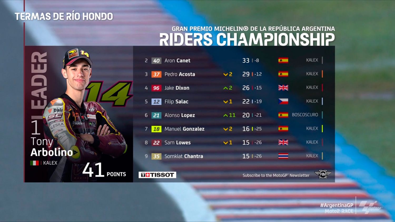 Tony Arbolino, piloto italiano del equipo Elf Marc VDS Racing Team, se impuso en el Gran Premio de la República Argentina de la categoría Moto2, que estuvo marcada por la intensa lluvia y una reducción a 14 vueltas, dejando atrás a Alonso López y Jake Dixon.