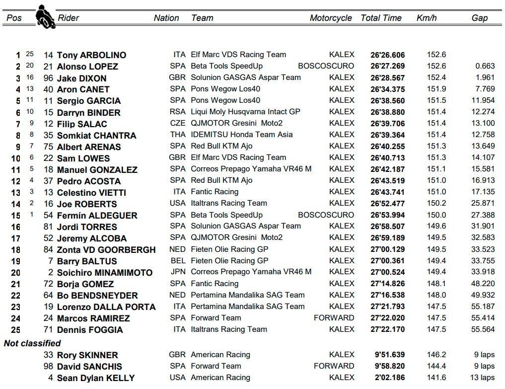 Pese a intentarlo, tanto Canet como el debutante de Moto2, Darryn Binder, que cerraba el Top 5, no conseguirían acercarse del todo a los tres pilotos más veloces en Argentina.