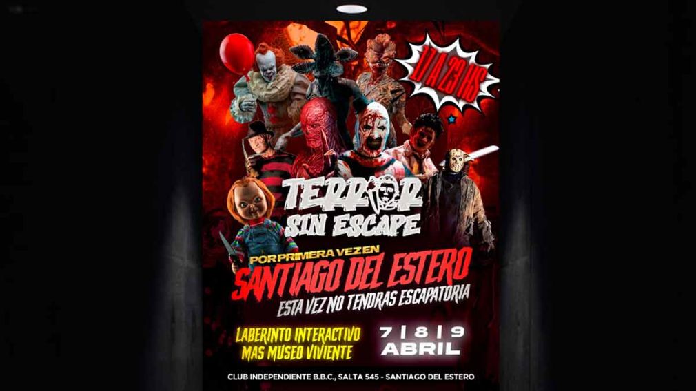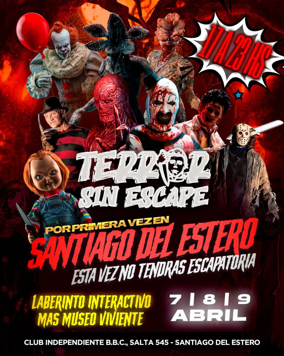 No será un fin de semana más en Santiago del Estero. Terror sin Escape llega a la provincia con una propuesta escalofriante. Vení y animate a pasar por las habitaciones del Exorcista y La Monja; Billy, del juego del miedo; Freddy Krueger; Mundo Payasos; IT 2000-90+Terrifier, Leatherface y su motosierra infernal; Jason; Vecna con los Demogorgon y el final más esperado por todos...."The Last of Us" Un mundo Post- apocalíptico, arrasado por un hongo, dónde todos mutaron a Zombis - Chasquedores que querrán atraparte ¡¡PARA DEVORARTE‼