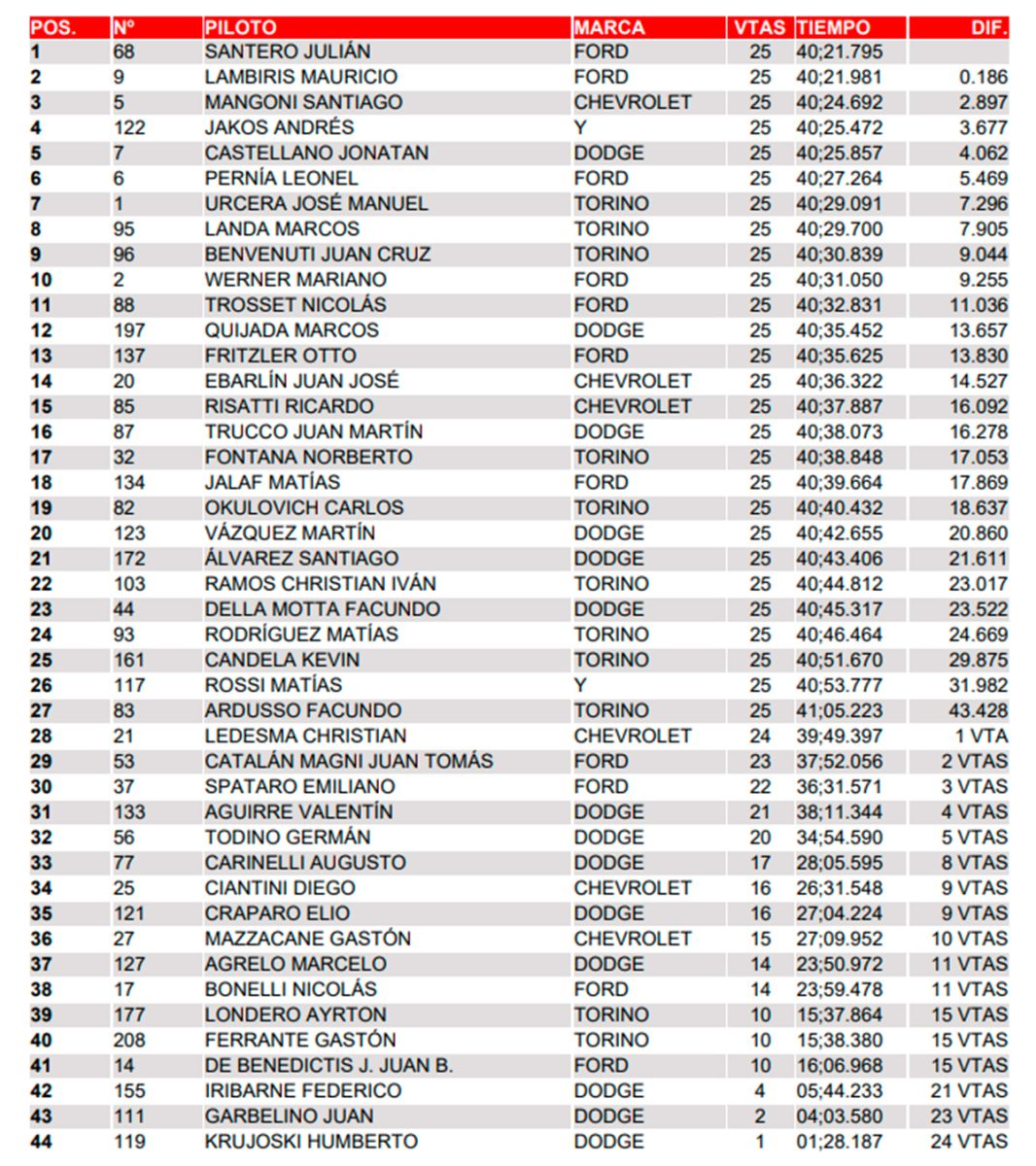 La grilla de llegada, hasta el décimo lugar, la completaron Andrés Jakos (Toyota), Jonatan Castellano (Dodge), Leonel Pernía (Ford), José Manuel Urcera (Torino), Marcos Landa (Torino), Juan Cruz Benvenuti (Torino) y Mariano Werner (Ford).