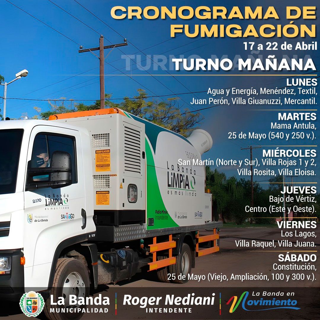El personal de la Secretaría de Servicios Públicos de la Municipalidad de La Banda dio a conocer el cronograma de fumigación correspondiente a la semana del lunes 17 al sábado 22 de abril.