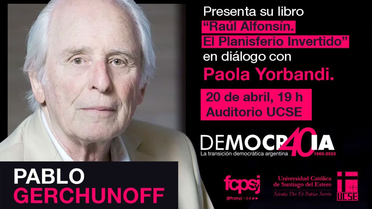 Gerchunoff llega a la provincia como parte de una agenda de actividades en el marco de la conmemoración por los 40 años del retorno a la democracia que contempla charlas, conferencias, clases magistrales, seminarios y más, organizado por la Facultad de Ciencias Políticas, Sociales y Jurídicas de la Universidad Católica de Santiago del Estero.