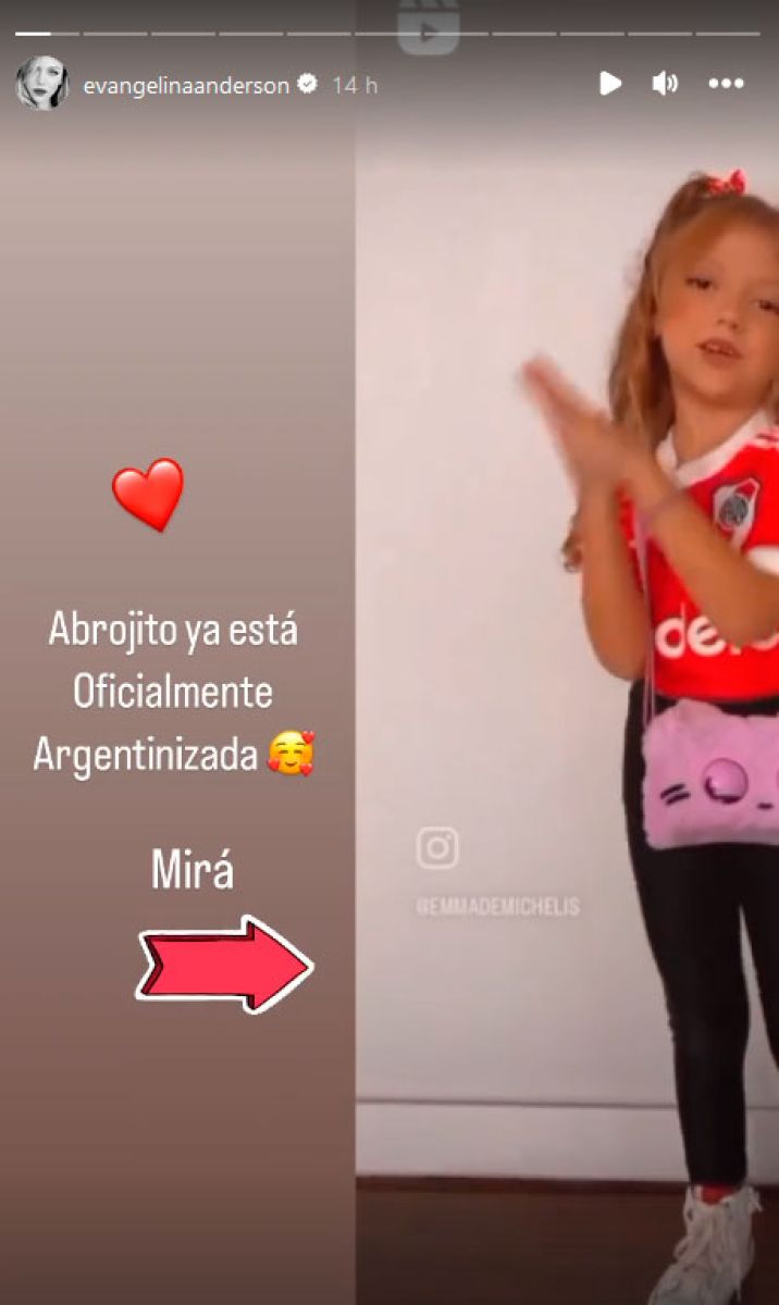 Evangelina Anderson compartió un tierno video de su hija menor, Emma Demichelis, bailando un tema de moda de TikTok y escribió: “Abrojito ya está oficialmente argentinizada”.