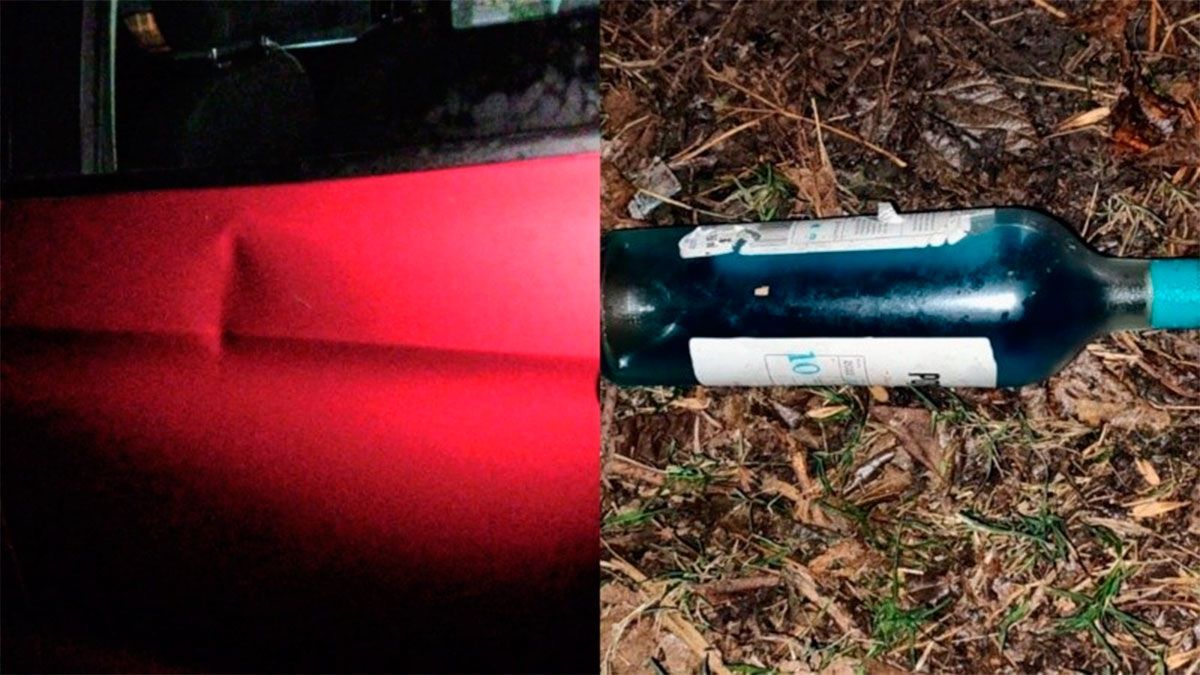 A pocos metros, en el suelo, hallaron una botella de vidrio con líquido que parecía ser combustible, aparentemente utilizada como bomba incendiaria para el ataque.