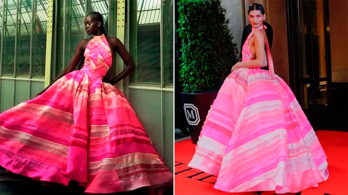 Sobre Grace Elizabeth, Lage profundizó: “Un trabajo maravilloso, está íntegramente hecho con recortes al bies aplicados uno a uno sobre otro, con un trabajo maravilloso. Tiene tiras, lo que cual hace que tenga un desperdicio increíble de tela y luego están colocadas a mano formando ese degrade de tonalidades, estampas. es maravilloso el trabajo de ese vestido, tienen muchísimo trabajo”.
