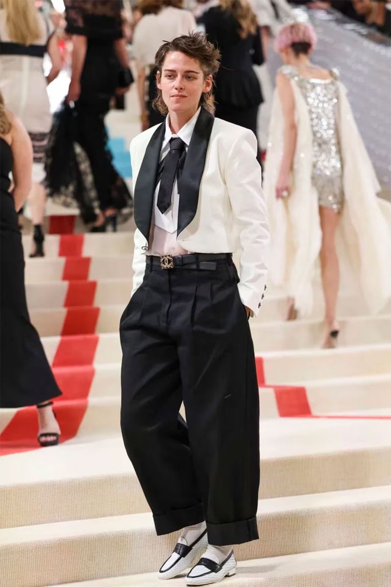 “Un excelente look en la línea de Lagerfeld. Todo tiene que ver con eso, inclusive la informalidad de los zapatos. Es absolutamente representativo del look Chanel, y el blanco y negro, es decir los colores partidos, se están viendo con todo”, consideró Lage sobre el paso de Kristen Stewart en la MET Gala.