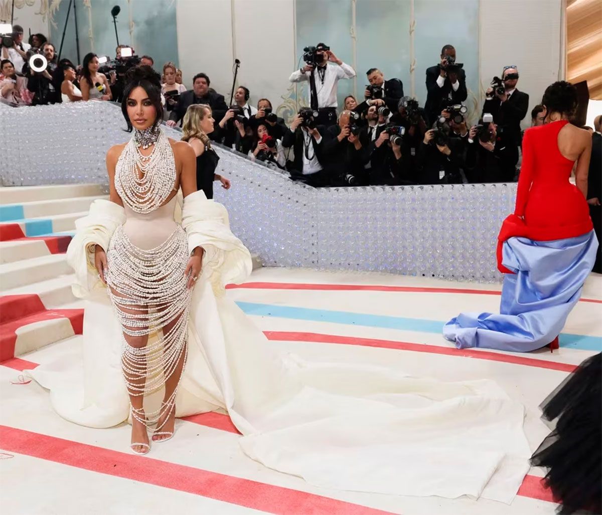 Kim Kardashian fue sin dudas una de las celebridades más esperadas de la alfombra blanca. “Me encanto el estilismo con corsage nude y completamente decorado con collares en perlas formando falda y top. Y completando con un collar muy barroco y una majestuosa capa con mangas al tono. Impactante look para esta Met carpet”, valoró Profumo.