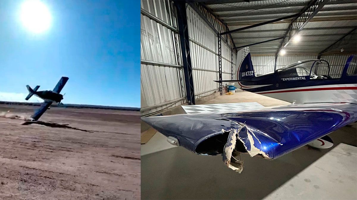 Lo cierto es que tras su vuelo rasante, el LV-X722 azul debió evaluar el daño en el ala derecha que impactó de lleno con el suelo del aeroclub.