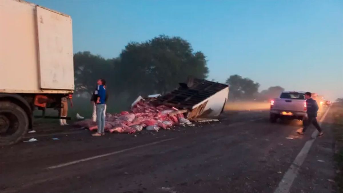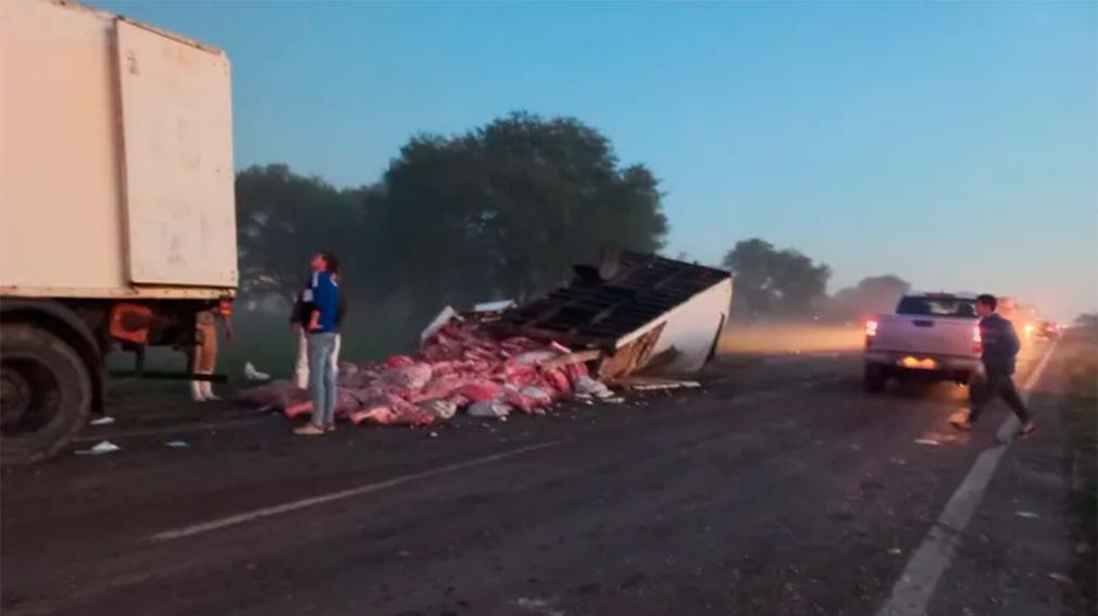 El siniestro vial ocurrió sobre la ruta 11, a la altura del kilómetro 12. Dos acompañantes del conductor resultaron con lesiones leves. Trabajadores del frigorífico llegaron rápidamente al lugar para levantar la carne.