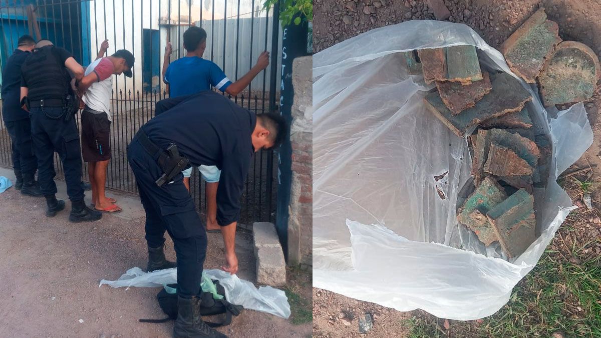 Al momento de ser demorados los mismos, tenían en su poder una bolsa plástica con placas de bronce, las cuales reconocieron habían sustraído del cementerio local.