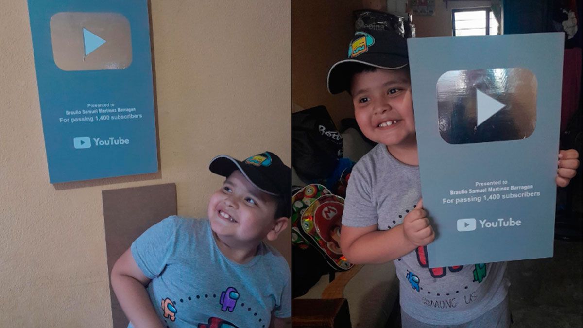 “Espero youtube no se ofenda no tengo los derechos, mi hijo quería una placa y se la hice de madera por superar los 1,400 suscriptores en su canal”, escribió Braulio Martínez, padre del pequeño en su muro de Facebook.