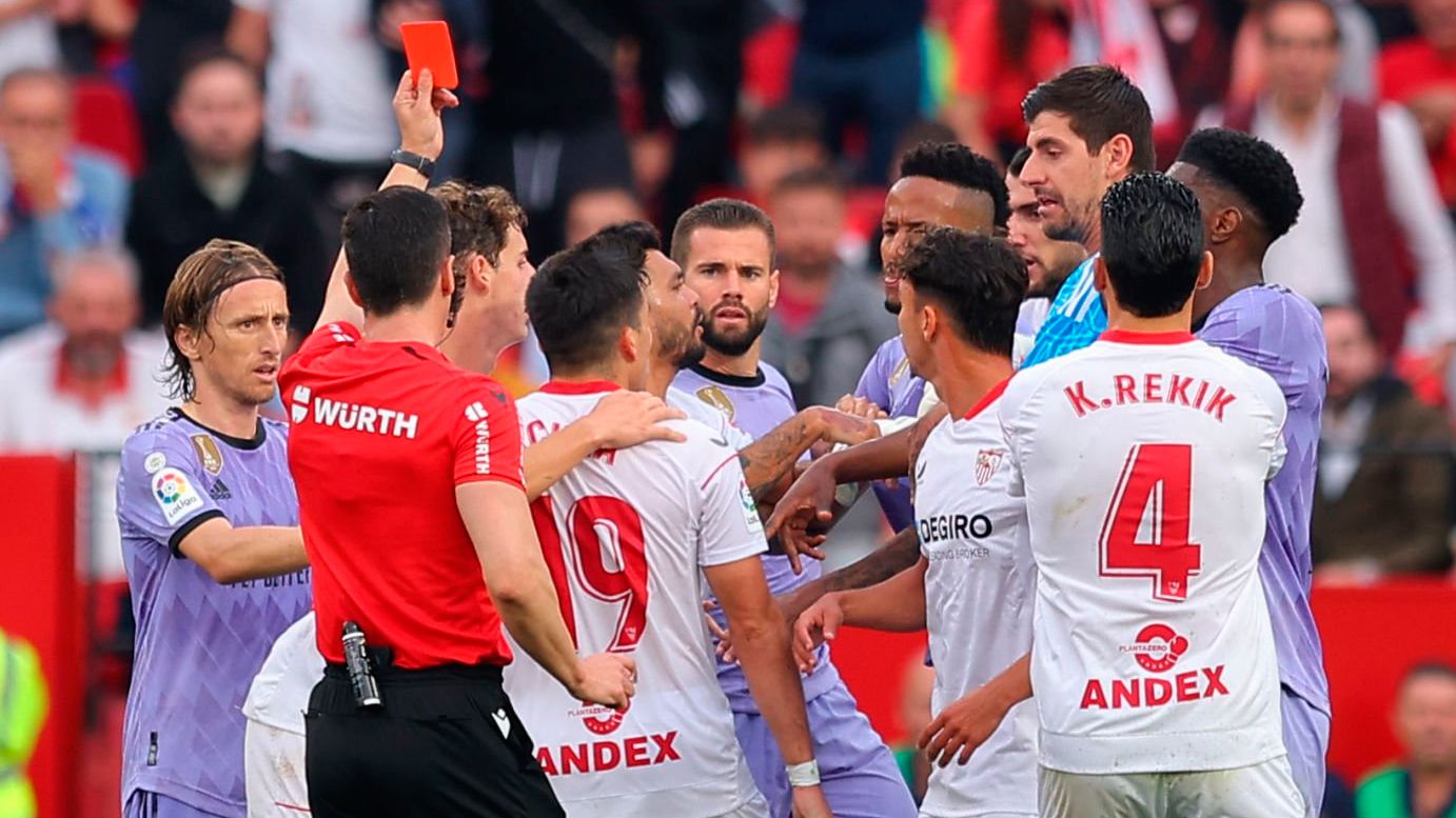 El defensor argentino Marcos Acuña vio la roja en la derrota de Sevilla ante Real Madrid por 2 a 1 como local, en un partido correspondiente a la 37ª fecha de LaLiga de España.