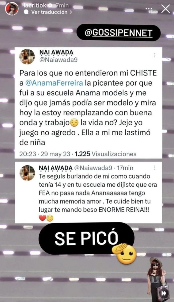 Pero el cruce no quedó ahí. El programa terminó y Nai continuó su descargo en las redes sociales donde, tal como lo captó La Criti, también integrante de Gossip, escribió: “Te seguís burlando de mí como cuando tenía 14 y en tu escuela me dijiste que era fea. No pasa nada Anamaaa. Tengo mucha memoria amor. Te cuidé bien tu lugar. Te mando beso enorme reina”.