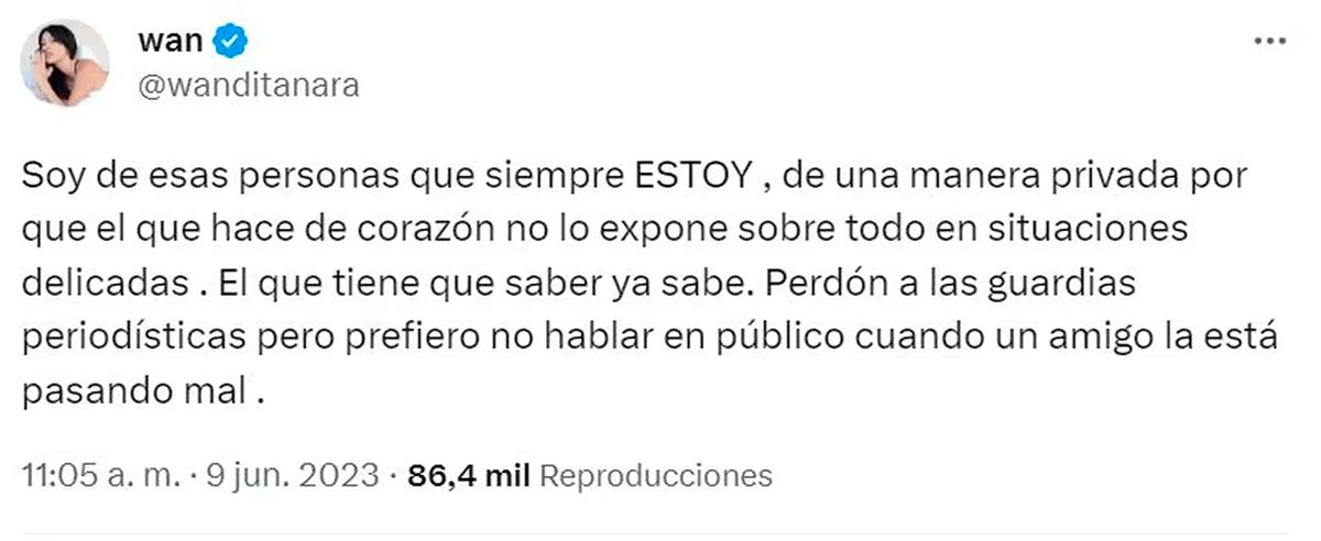 A la mediática le dijeron que abandonó a su amigo en el peor momento y que ahora que Mauro Icardi llegó a la Argentina con sus dos hijas ya no quiere saber nada con el músico, al que utilizó para darle celos al deportista. Cansada de los comentarios malintencionados, emitió un breve descargo en el que también les habló a los periodistas que la esperan para obtener alguna declaración sobre el tema.