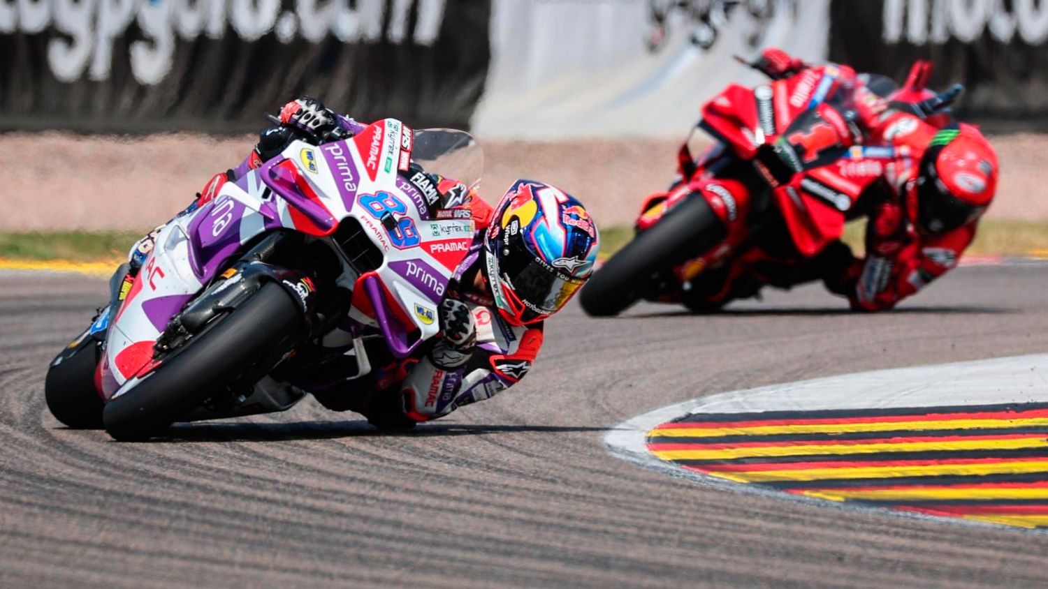Jorge Martín, piloto español a bordo de una Ducati, se adjudicó el Gran Premio de Alemania de MotoGP, al aventajar mínimamente al campeón, el italiano Francesco Bagnaia (Ducati), en una atractiva carrera disputada en el autódromo de Sachsenring, por la séptima cita del calendario anual de la disciplina.