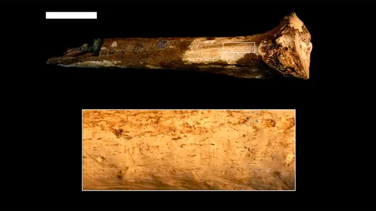 El análisis del antiguo hueso de un pariente del Homo sapiens, determinó que nueve de las once marcas correspondían claramente al tipo de daño infligido por herramientas de piedra.
