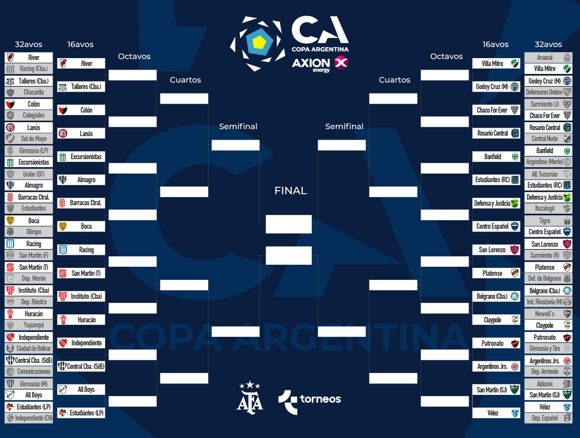 La AFA programó varios de los encuentros correspondientes a los 16avos de final de la Copa Argentina en donde el representante de Santiago del Estero, Central Córdoba, enfrentará a Independiente, mientras que también saldrán a escena River Plate y Boca Juniors.