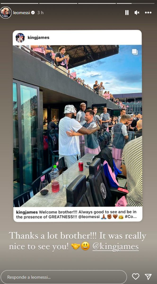 "¡Muchas gracias, hermano! Fue muy agradable verte", expresó la Pulga en un mensaje en inglés en redes sociales, compartiendo también el tremendo posteo de la estrella de la NBA y de Los Angeles Lakers, con quien se abrazó antes del inicio del encuentro.