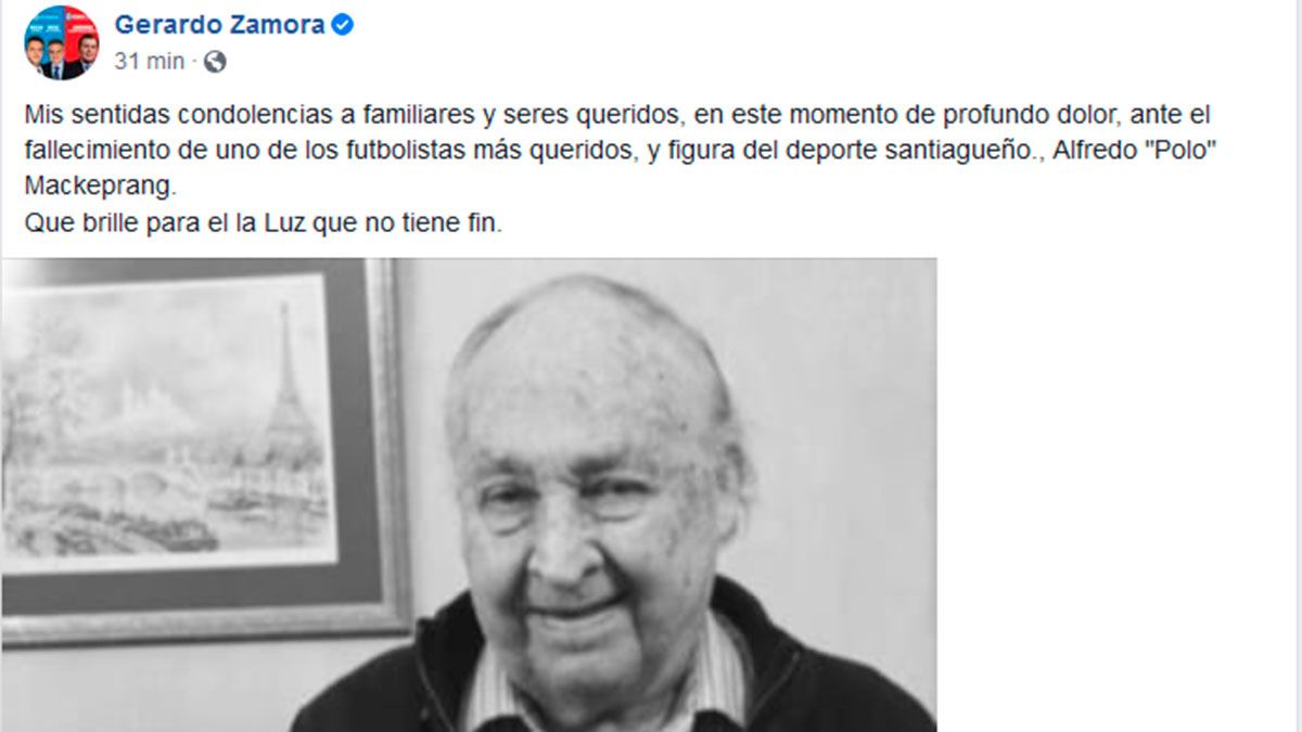“Mis sentidas condolencias a familiares y seres queridos, en este momento de profundo dolor, ante el fallecimiento de uno de los futbolistas más queridos, y figura del deporte santiagueño., Alfredo "Polo" Mackeprang. Que brille para el la Luz que no tiene fin”, escribió el gobernador.