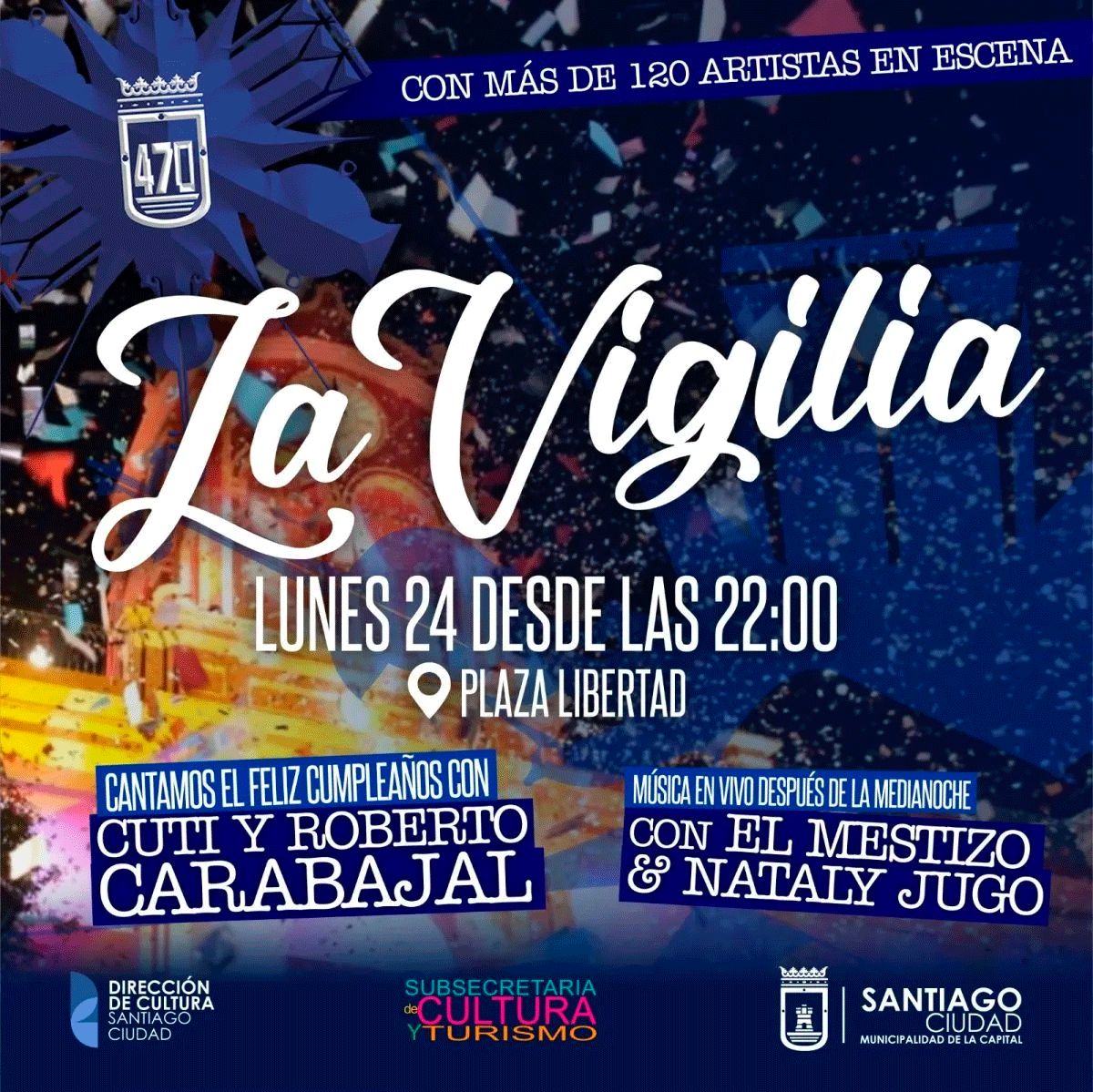 A partir de las 22 horas de este lunes, dará inicio la Vigilia Popular en la Plaza Libertad para esperar los 470 años de la ciudad de Santiago del Estero, con un espectáculo de primer nivel en el que participarán más de 120 artistas.