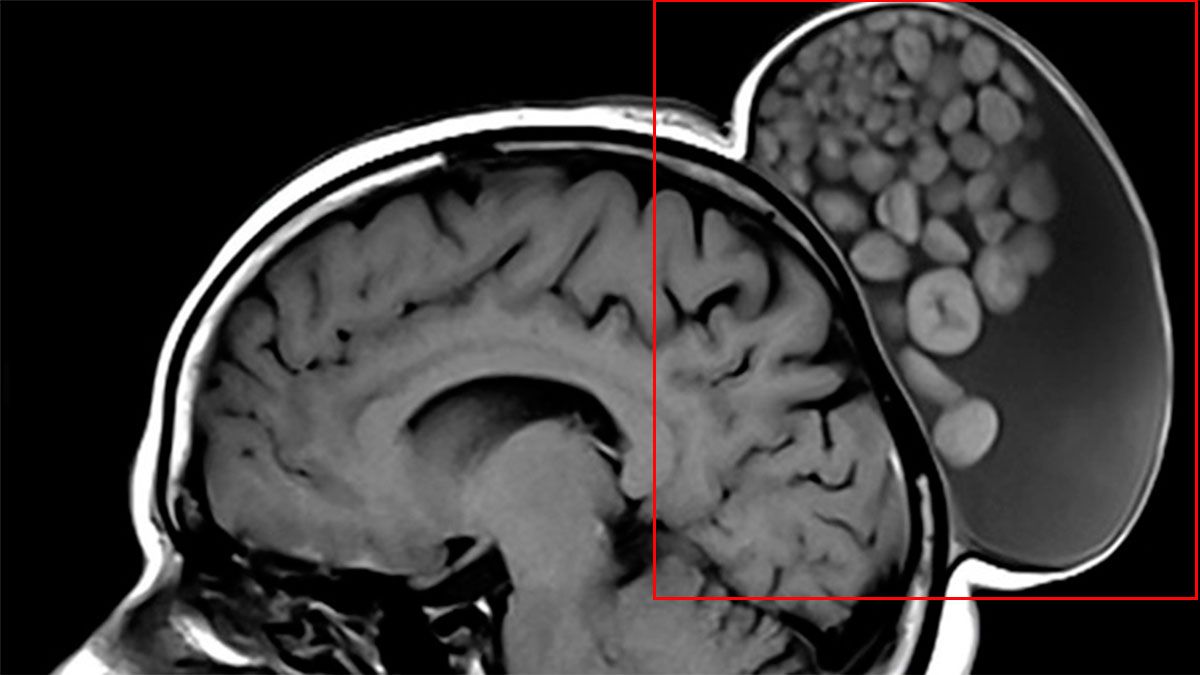 La paciente nunca había buscado atención médica y manifestó que nunca había sentido dolor. Solo se presentó en el hospital cuando la masa ya había crecido en la región parieto-occipital más de 15 cm de largo, por más de 10 cm de ancho y más de 12 cm de alto.