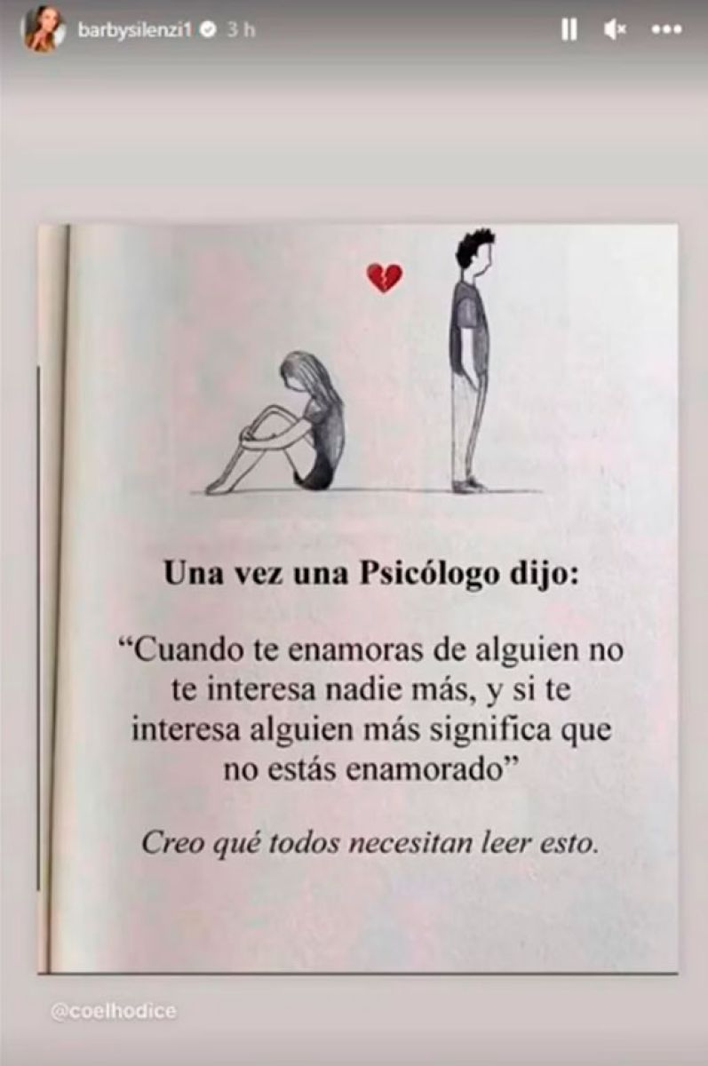 “Una vez una psicóloga dijo: ‘cuando te enamorás de alguien no te interesa nadie más. Y si te interesa alguien más significa que no estás enamorado’”, dice una imagen que Barby re publicó de una cuenta de Instagram que difunde mensajes de autoayuda. “Creo que todos necesitan leer esto”, cierra el escrito que además incluye un dibujo elocuente por demás: una mujer sentada sobre el suelo y con actitud de abatida y un hombre parado mirando para la dirección contraria. Entre los dos, flota un corazón roto. ¿Crisis en puerta?