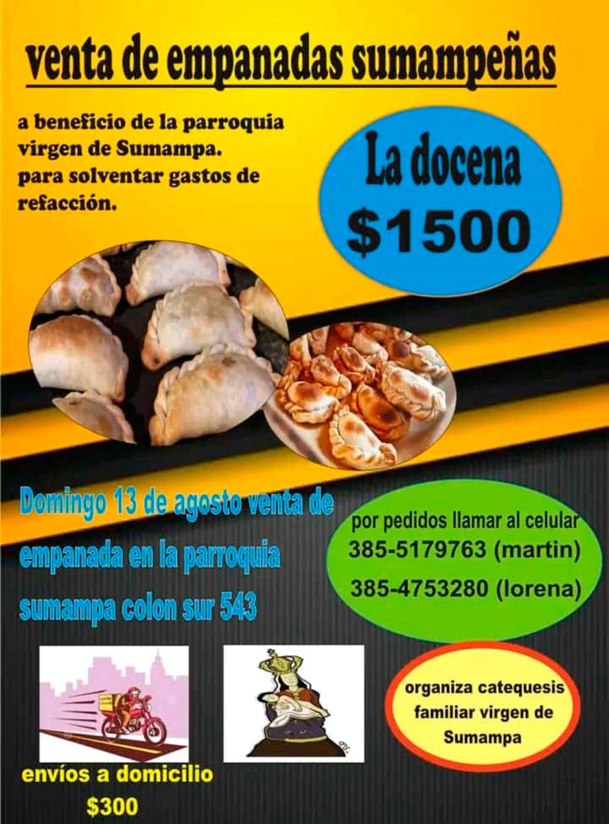 Otra manera de contribuir es comprando las empanadas que preparan para la venta miembros de la Catequesis familiar Virgen de Sumampa este domingo 13 de agosto. Pueden hacer los pedidos a los números 3855179763 (Martín) / 3854753280 (Lorena).