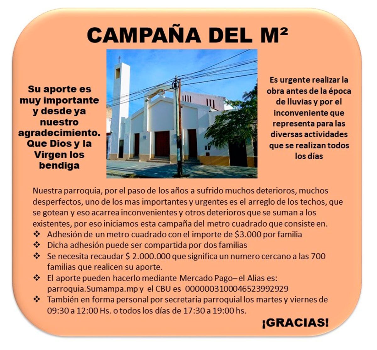 Quienes deseen y puedan sumarse a la campaña para recaudar fondos pueden hacerlo donando una bolsa de cemento o bien el valor de la misma en dinero. En caso de optar por la segunda opción pueden concretar la donación de manera personal en el templo parroquial (Colón Sur 543) o realizando una transferencia a la cuenta de MercadoPago con el alias parroquia.Sumampa.mp o con el CBU 0000003100046523992929.