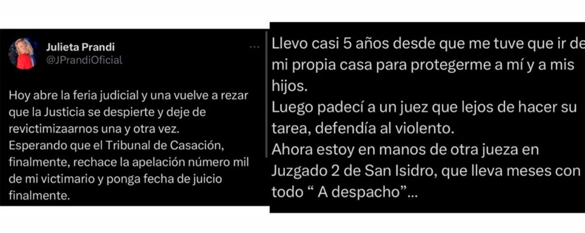 Posteriormente, continuó: “Llevo casi 5 años desde que me tuve que ir de mi propia casa para protegerme a mí y a mis hijos. Luego padecí a un juez que lejos de hacer su tarea, defendía al violento. Ahora estoy en manos de otra jueza en Juzgado 2 de San Isidro, que lleva meses con todo 'A despacho'…"