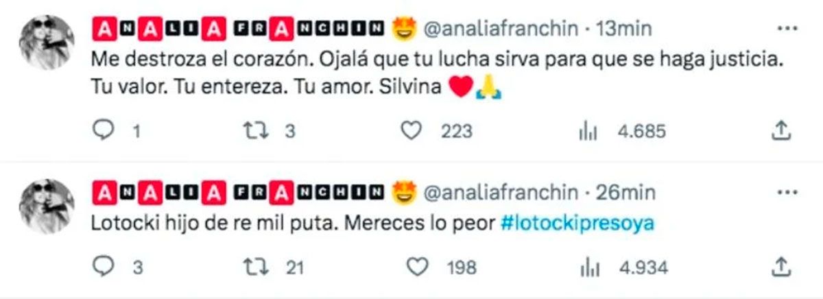 Por su parte, Analía Franchin disparó toda su bronca contra Anibal Lotocki, el médico responsable de las cirugías estéticas que ocasionaron los problemas de salud en la modelo. "Lotocki hijo de re mil put*. Mereces lo peor #lotockipresoya", opinó la periodista. Luego, agregó: "Me destroza el corazón. Ojalá que tu lucha sirva para que se haga justicia. Tu valor. Tu entereza. Tu amor. Silvina".