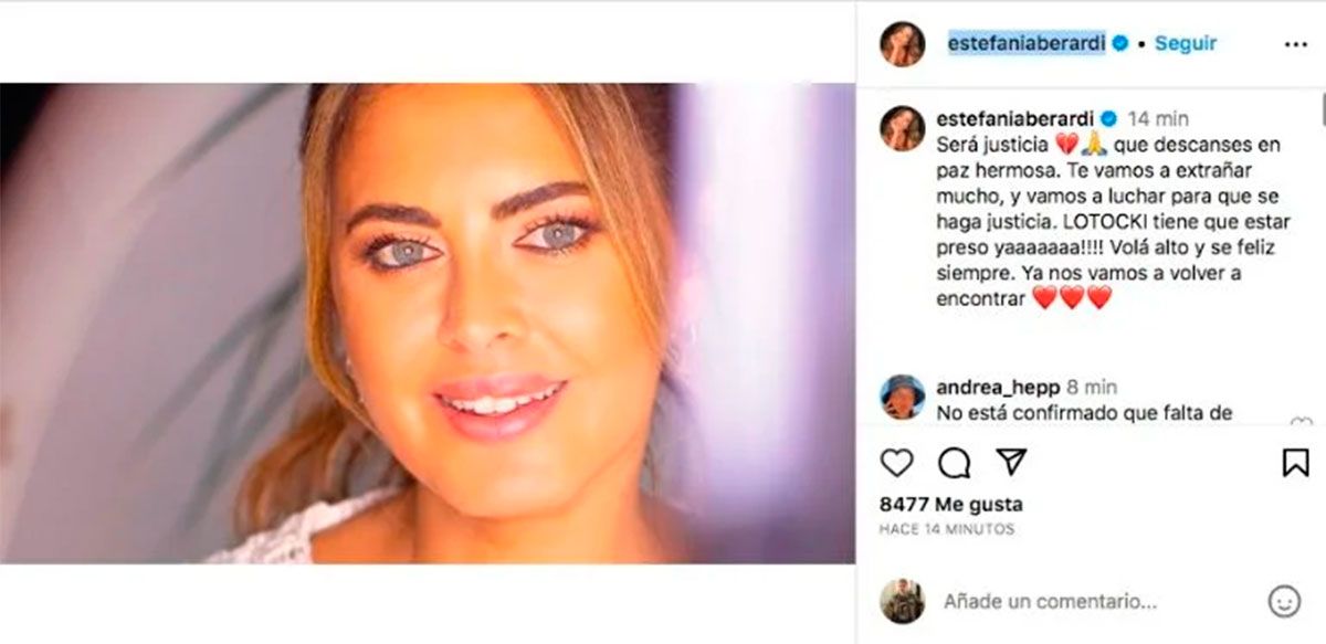 "Será justicia. Que descanses en paz hermosa. Te vamos a extrañar mucho, y vamos a luchar para que se haga justicia. Lotocki tiene que estar preso yaaaaaaa!!!! Volá alto y se feliz siempre. Ya nos vamos a volver a encontrar", compartió Estefi Berardi.