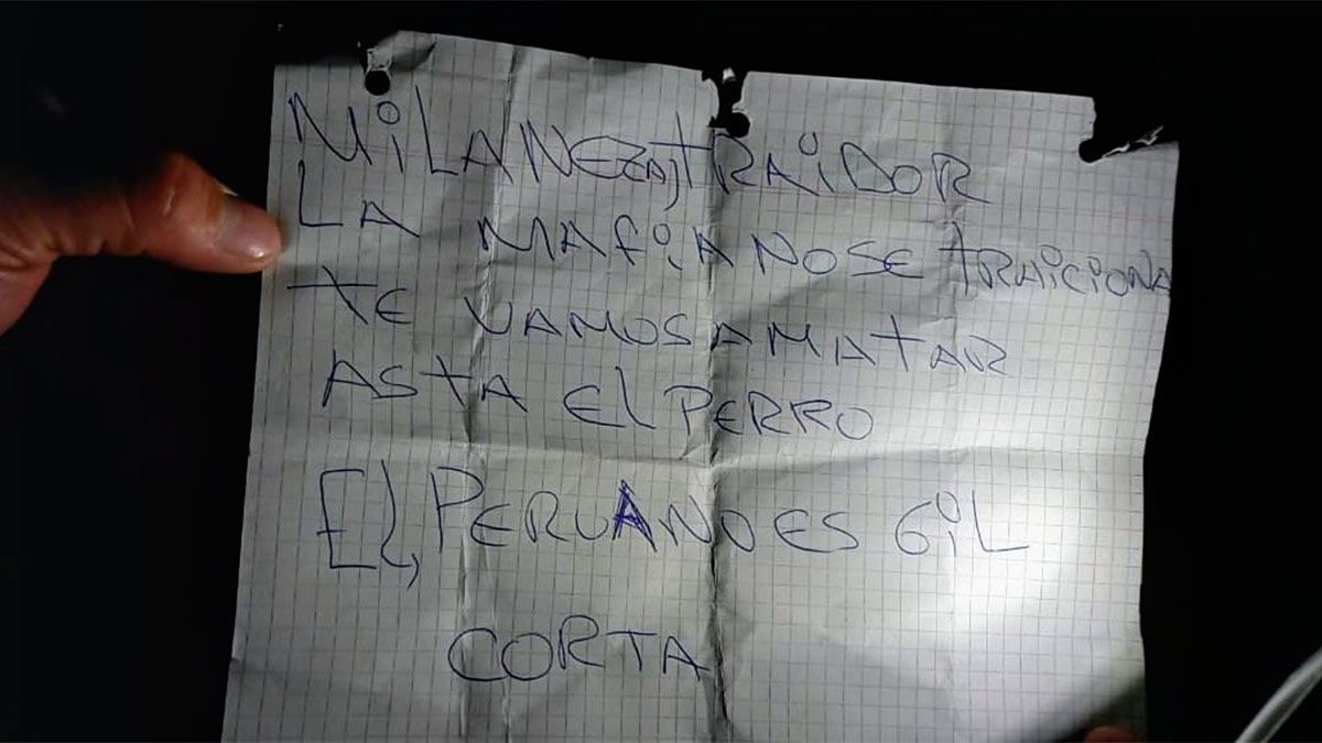 Asimismo relató que cuando todo terminó, salieron y encontraron en la vereda una papel escrito a mano, cuyo decía: "Milaneza (sic) traidor, la mafia no traiciona, te vamos a matar asta (sic) el perro, el peruano es gil".