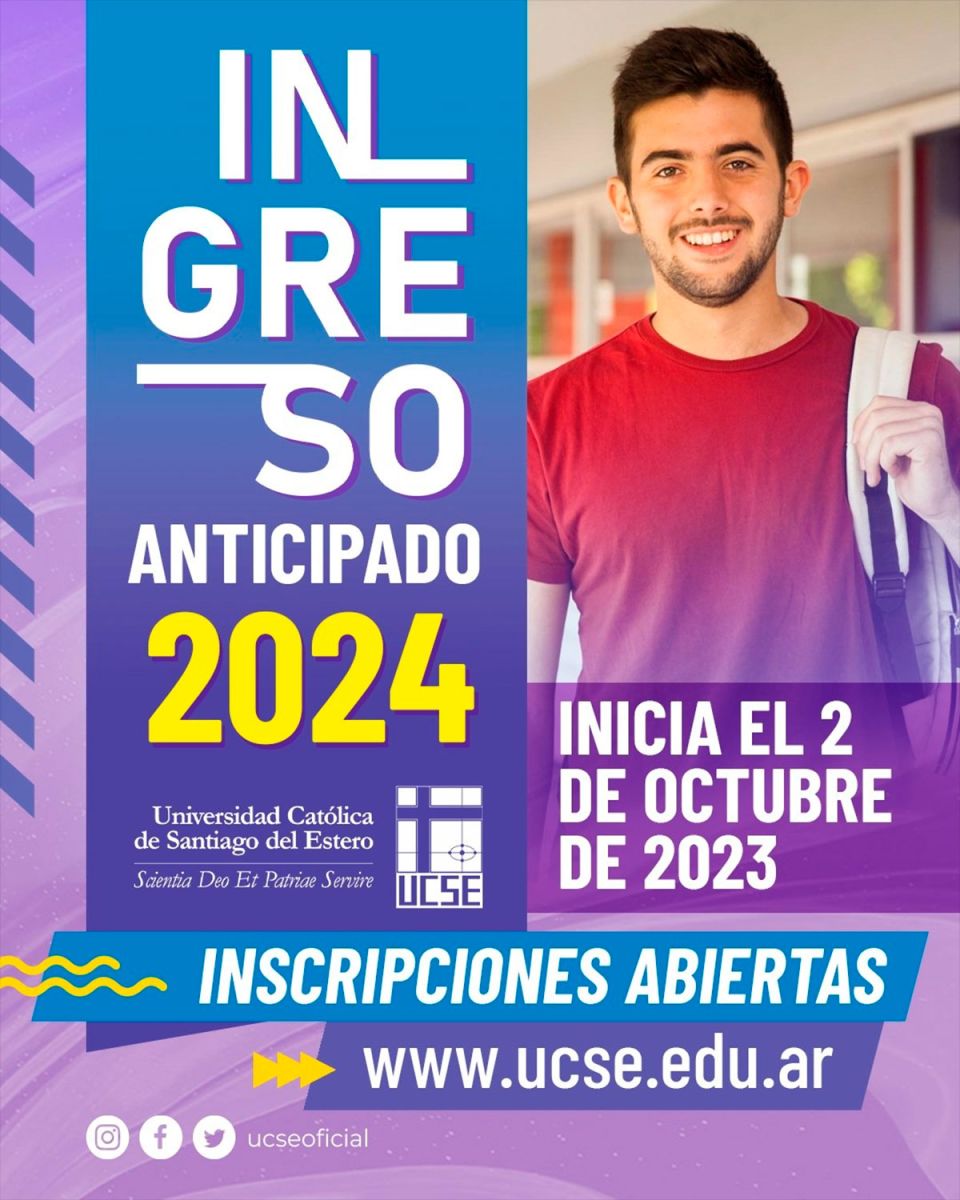 El lunes 2 de octubre comienza el Ingreso Anticipado 2024 a la Universidad Católica de Santiago del Estero y ya se encuentran abiertas las inscripciones a través de la página web www.ucse.edu.ar